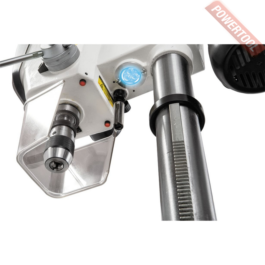 Предусмотрен основной набор регулировок, включая смену частоты вращения шпинделя за счет переустановки ремней (передача двухступенчатая). На одной из ступеней - натяжитель с быстрозажимной фиксацией барашком, что позволяет ослаблять его без использования вспомогательных инструментов. Станок оборудован лазерным указателем центра сверления в виде перекрестья двух лучей и светодиодным фонариком подсветки с регулировкой направления светового луча.