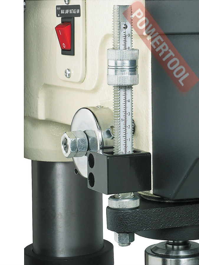 - Регулируемый ограничитель глубины сверления. Для контроля глубины сверления предусмотрена шкала с миллиметровой и дюймовой разметкой, а также регулируемый ограничитель.