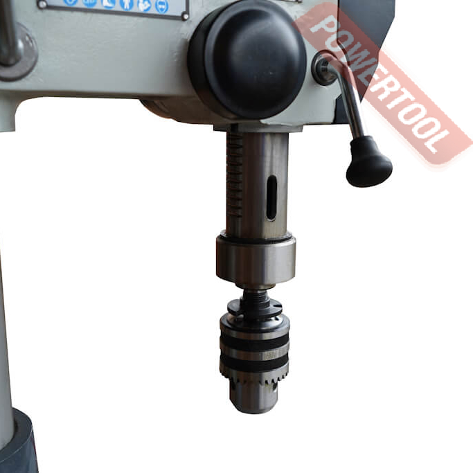 С передней стороны сверлильной головы расположены кнопки включения и выключения станка. С правой стороны сверлильной головы расположена трехлучевая рукоятка опускания пиноли с нониусом. Ход пиноли станка составляет 80 мм. Конус пиноли МТ2. Вылет пиноли можно зафиксировать в нужном положении при помощи рукоятки, которая расположена с левой стороны станка. Высота сверлильной головы устанавливается с помощью вращения рукоятки, перемещение осуществляется по зубчатой рейке. В стандартную комплектацию входят: сверлильный патрон, ключ патрона, шестигранный ключ, инструкция на русском языке.