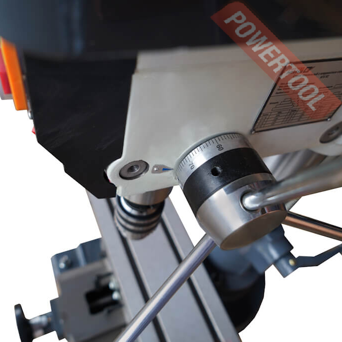 Скорость вращения шпинделя регулируется с помощью перекидывания ремней в блоке ременных шкивов. Схема положения ремней с диапазоном оборотов расположена с правой стороны станка. Широкий диапазон оборотов шпинделя от 320 до 3300 об/мин обеспечивает качественное сверление материалов.