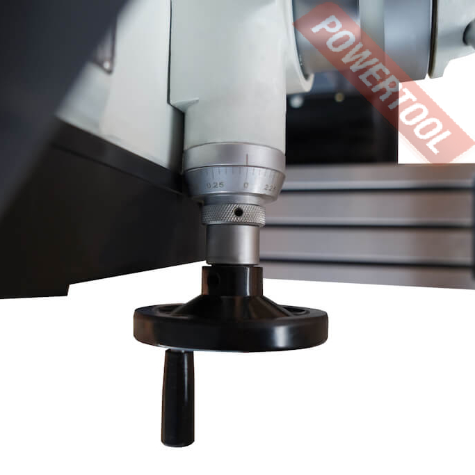 Для удобства позиционирования заготовки, станок оснащен координатным столом размером 730x210 мм, ход стола составляет 450х170 мм. Также, на столе есть три Т-образных паза размером (14х3х45), с помощью которых вы можете установить дополнительную оснастку для крепления заготовок. Перемещение стола можно зафиксировать с помощью специальных винтов. Также, стол оснащен ограничителем хода по оси X. Цена деления лимба по оси X\Y составляет 0,05 мм.