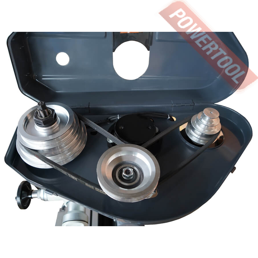 Скорость вращения шпинделя регулируется с помощью перекидывания ремней в блоке ременных шкивов. Схема положения ремней с диапазоном оборотов расположена с правой стороны станка. Широкий диапазон оборотов шпинделя от 100 до 2150 об/мин обеспечивает качественное сверление материалов.