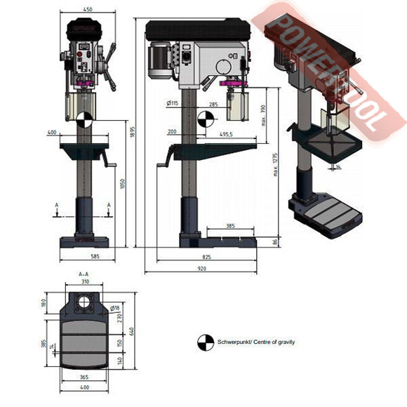 Сверлильный станок, 2200 Вт, 380 В, max диаметр сверления 34 мм, max нарезаемая резьба M12, частота вращения шпинделя 145-4800 об/мин, 18 скоростей, бесступенчатая регулировка оборотов, индикация числа оборотов, конус шпинделя КМ-4, посадочное сверлильного патрона B16, диапазон хвостовиков для патрона 1-16 мм, ход пиноли шпинделя 160 мм, вылет шпинделя 285 мм, шпиндель-стол 790 мм, шпиндель-основание 1275 мм, диаметр стойки 115 мм, размер основания 637х400 мм, размер стола 420х400 мм, угол поворота стола 360 градусов, 2 Т-образных паза 14 мм, подсветка рабочей зоны, габариты 920х585х1895 мм, вес 260 кг, в комплекте патрон быстрозажимной В16 1-16 мм, оправка КМ-4/B16, защитный экран.