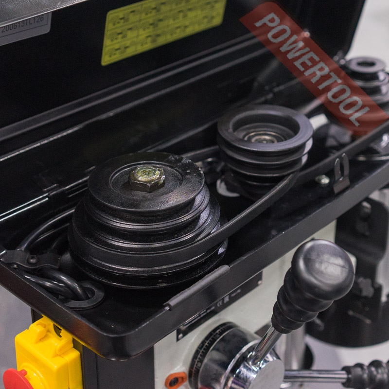 Сверлильный станок, 450 Вт, 220 В, max диаметр сверления 16 мм, частота вращения шпинделя 200-2500 об/мин, 12 скоростей, ступенчатая регулировка оборотов, конус шпинделя КМ-2, посадочное сверлильного патрона B16, диапазон хвостовиков для патрона 3-16 мм, ход пиноли шпинделя 60 мм, вылет шпинделя 125 мм, шпиндель-стол 391 мм, шпиндель-основание 510 мм, диаметр стойки 60 мм, размер основания 348х215 мм, размер стола 196х195 мм, наклон стола влево/вправо 45/45 градусов, размер Т-образного паза 16 мм, габариты 530х310х850 мм, вес 29 кг, в комплекте патрон ключевой В16 3-16 мм, оправка КМ-2/B16, защитный экран, набор инструментов, тиски.