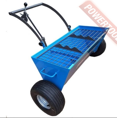 Тележка для внесения топпинга и упрочняющей смеси, рабочая ширина 1000 мм, вместимость бункера тележки до 125 кг, предназначена для рассыпки топпинга по поверхности свежего бетона с точно регулируемым расходом от 1 до 6 кг на 1 кв.м, расход регулируется с помощью специального рычага управления расположенного на ручке тележки, сетка бункера с ножом для разрезания мешков, пневматические колеса, ножка для опоры, габариты ДхШхВ 1200х1000х750 мм, вес тележки 42 кг
