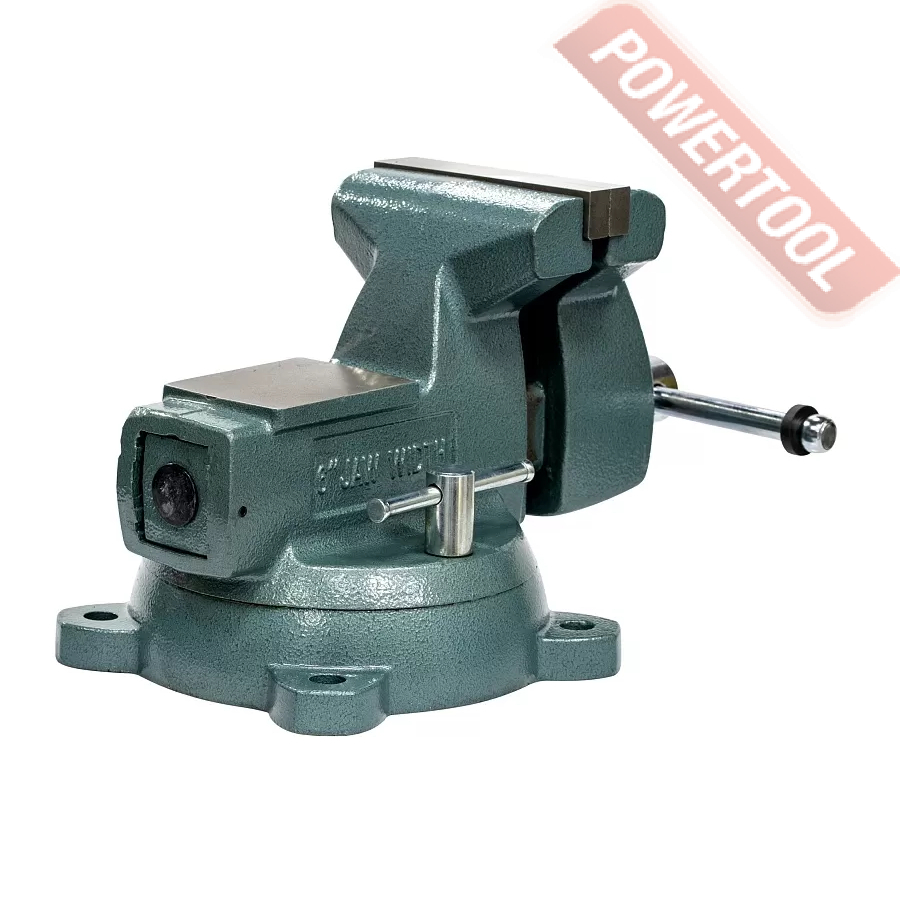 Тиски слесарные поворотные, ширина губок 152 мм, рабочий ход 152 мм, глубина зева 105 мм, размер наковальни 85,7х101,6 мм, диаметр зажима трубы 13,5-75,5 мм, функция поворота 360 градусов, размер ДхШхВ 445х260х290 мм, вес 29 кг.
