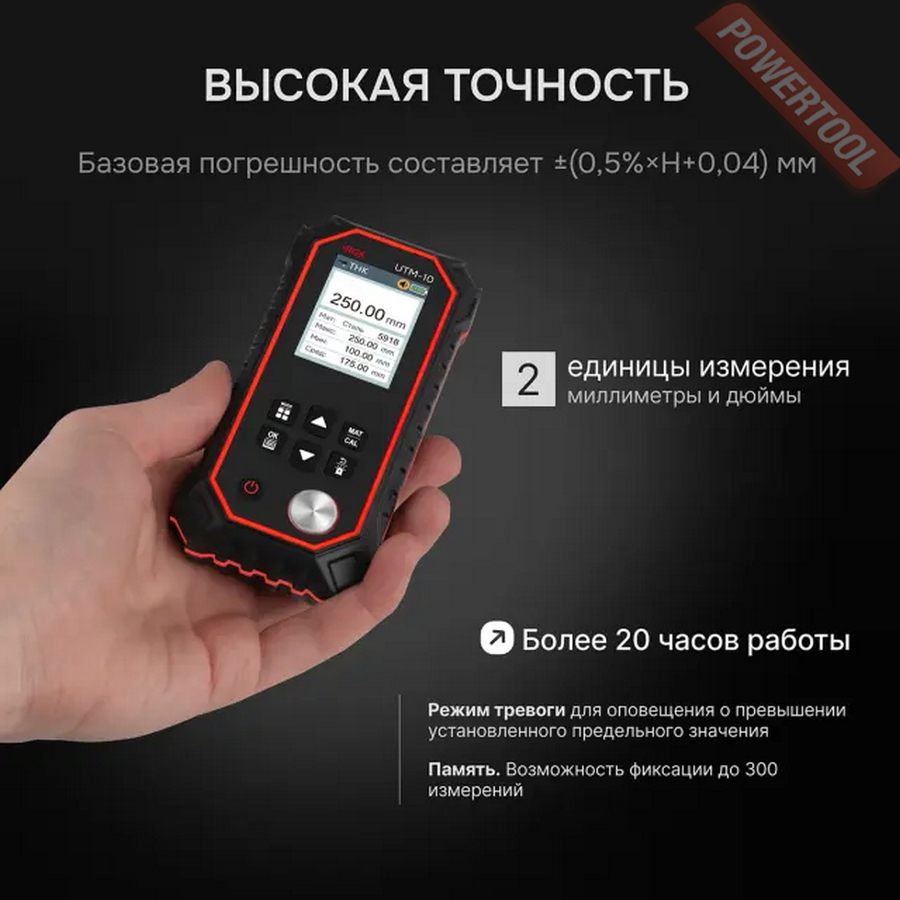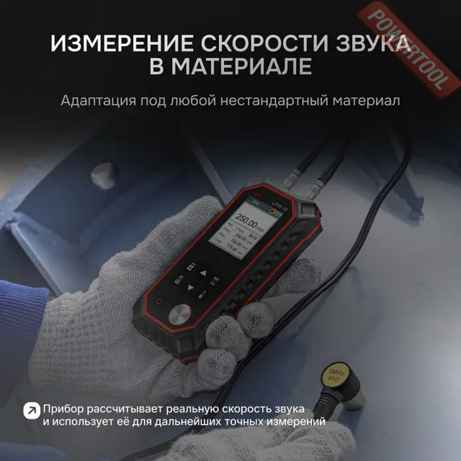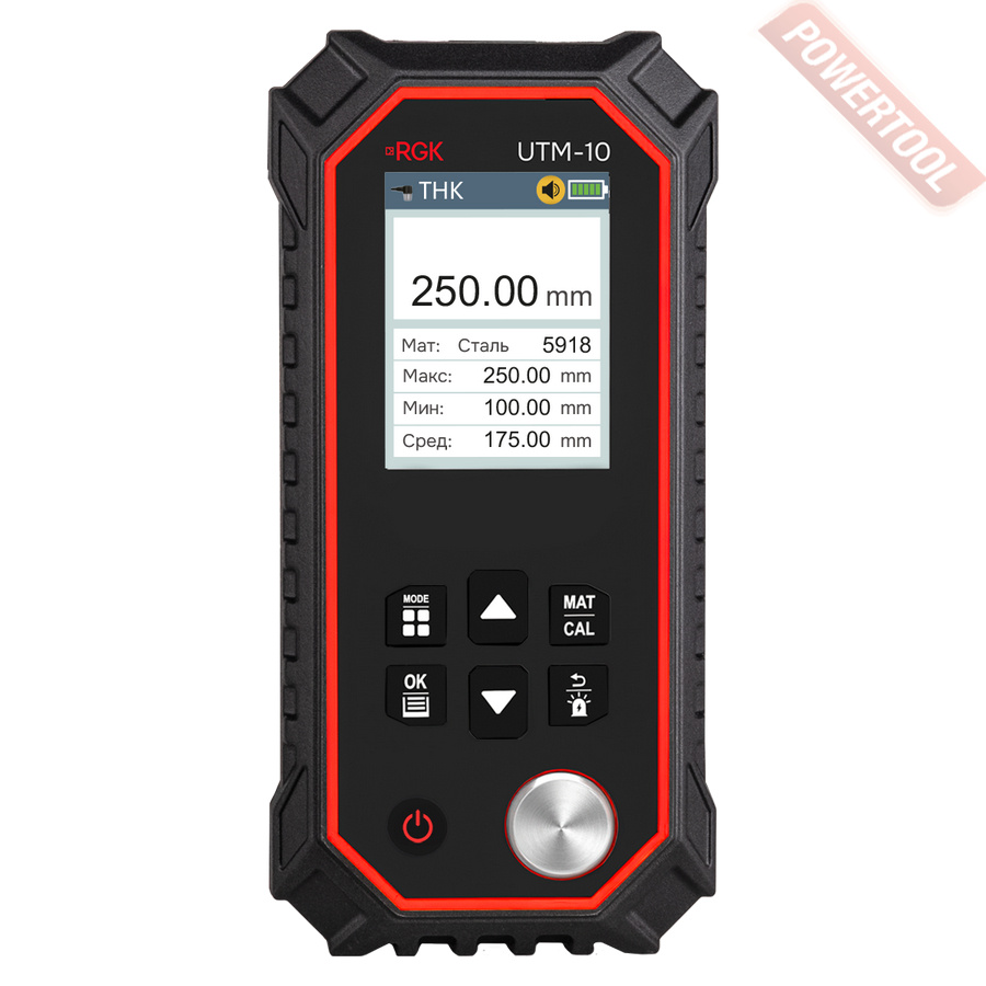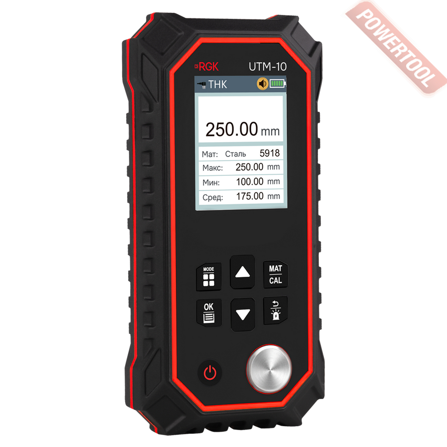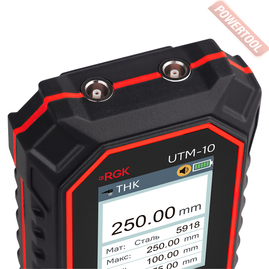 Предусмотрена возможность замены комплектного датчика на опциональные дополнительные зонды с другим частотным диапазоном, а также на сенсор в жаропрочном исполнении, предназначенный для проверки геометрии отливок, поковок и других изделий с высокой степенью нагрева. Для повышения точности при контроле геометрических параметров толщиномер RGK UTM-10 реализует функцию предварительного определения скорости распространения УЗ колебаний в конкретном материале. Данные можно сохранять для 3 пользовательских вариантов в настроечной таблице и использовать в ходе дальнейших измерений толщины. Инструмент запитывается от 3 батарей популярного типоразмера AA, что обеспечивает возможность выполнения измерений в любом месте.