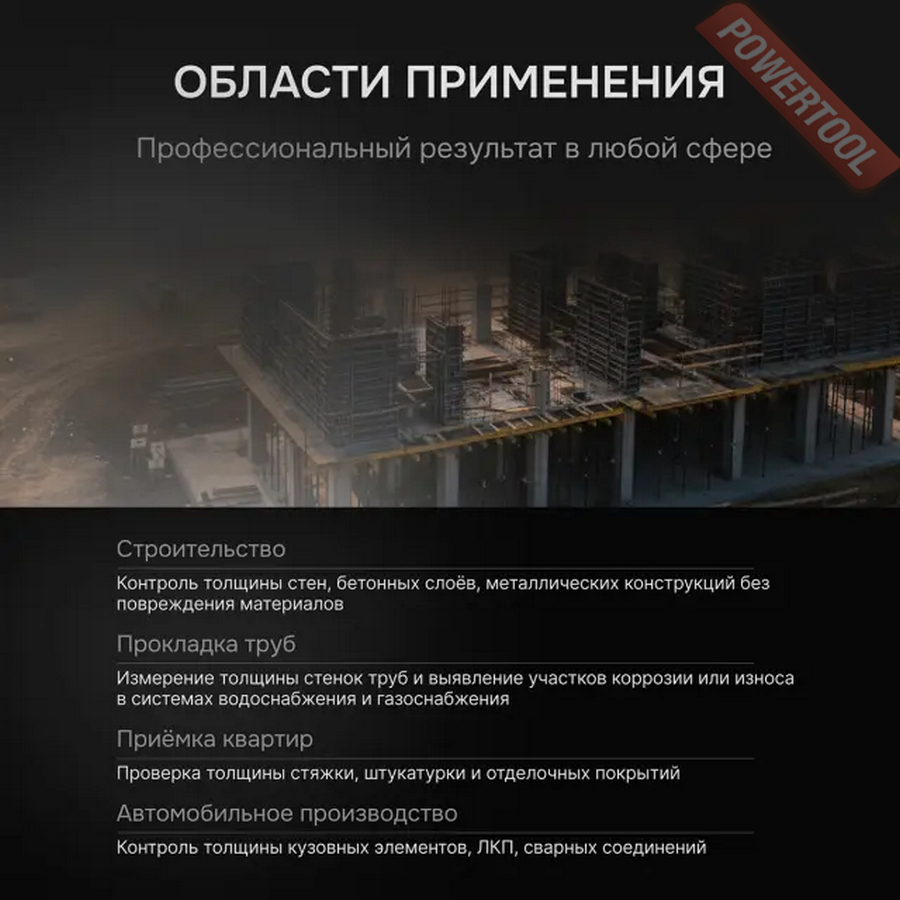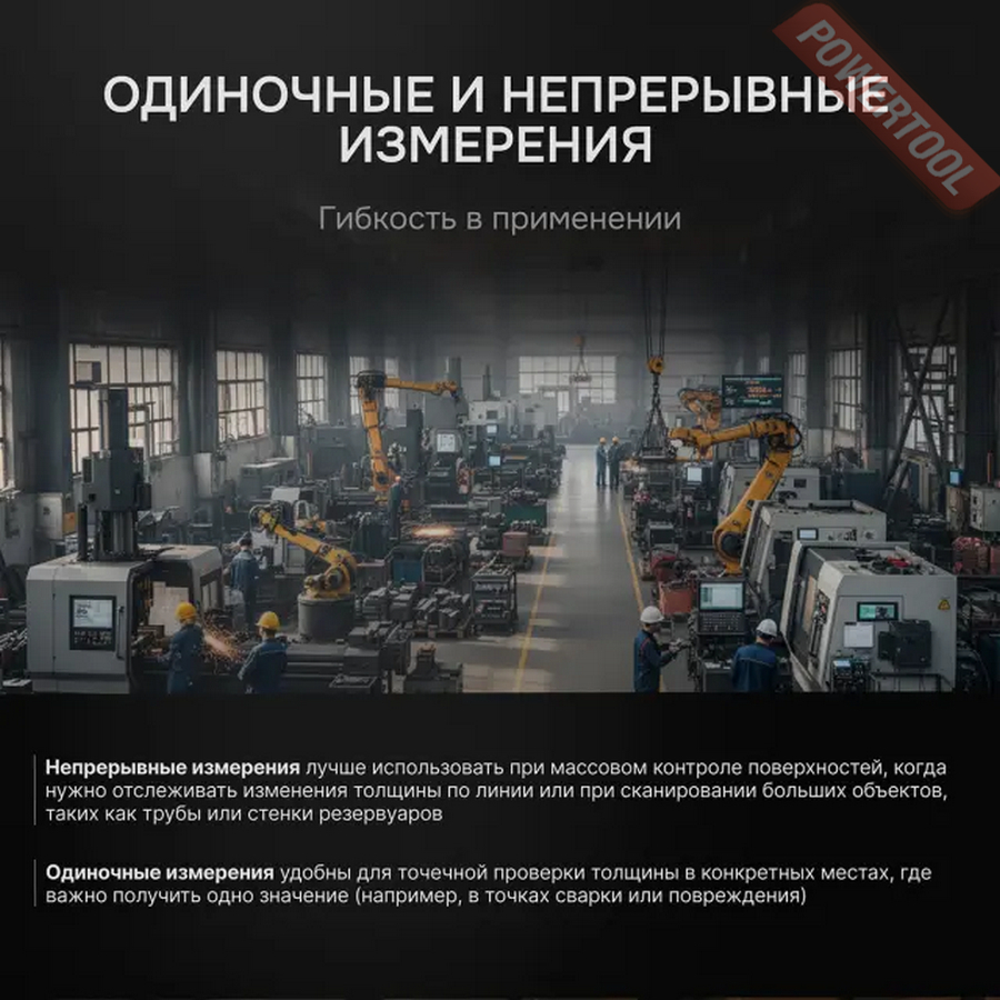 Мобильный толщиномер поддерживает несколько рабочих режимов. Прибор позволяет выполнять одноточечные измерения, а также определять толщину целевых объектов в непрерывном режиме, с регистрацией наибольшего, наименьшего и среднего показателей. Для выявления локальных истончений и неоднородности толщины конструкционных элементов служит режим измерений с сигналом тревоги, срабатывающим при превышении настраиваемых допустимых пределов.
