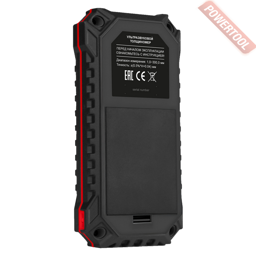 Толщиномер ультразвуковой, диапазон измерений 1-300 мм, диапазон скорости звука 1000-9999 м/с, функция Min/Max, функция AVG, память на 300 значений, ЖК-дисплей, питание от 3 батареек 1,5В тип АА, размер ДхШхВ 127,5х62х26,8 мм, вес 0,11 кг, элементы питания, контактный гель, датчик, кейс.