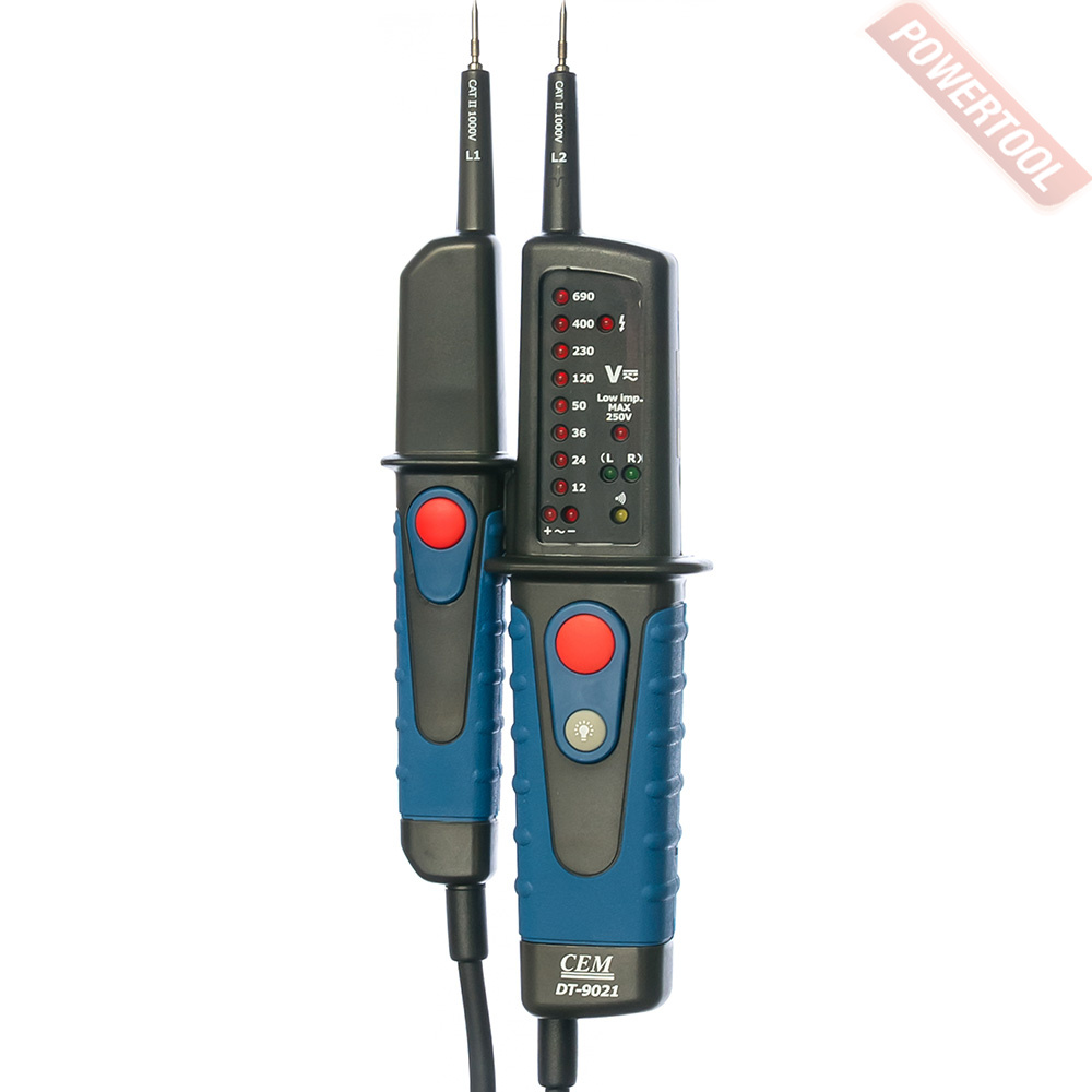 Указатель напряжения CEM DT-9021 представляет собой мобильный инструмент в виде двухполюсного тестера, разработанный для оперативного персонала аварийных бригад и специалистов по обслуживанию электросетей. Изделие позволяет выполнять основные рутинные операции – контролировать наличие переменного и постоянного напряжения в проводниках и оценивать его номинал, распознавать "фазную" и "нейтральную" линии и полярность источников постоянного тока, а также проверять исправность электрических цепей и полупроводниковых устройств, без задействования мультиметра. Дополнительно в данной модели реализован режим определения направления вращения поля, что дает возможность использовать измеритель при диагностике и подключении трехфазных двигателей, трансформаторов и прочего силового электрооборудования.