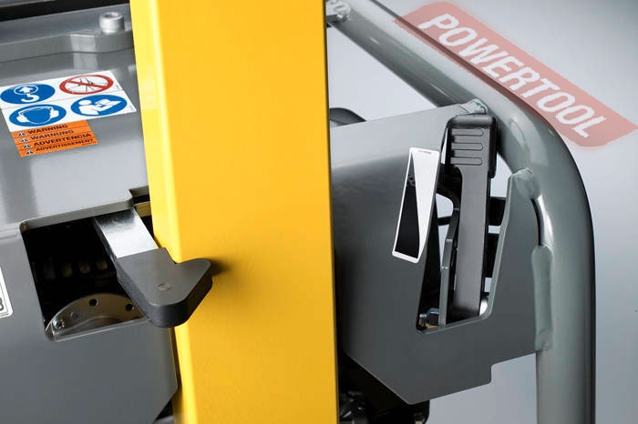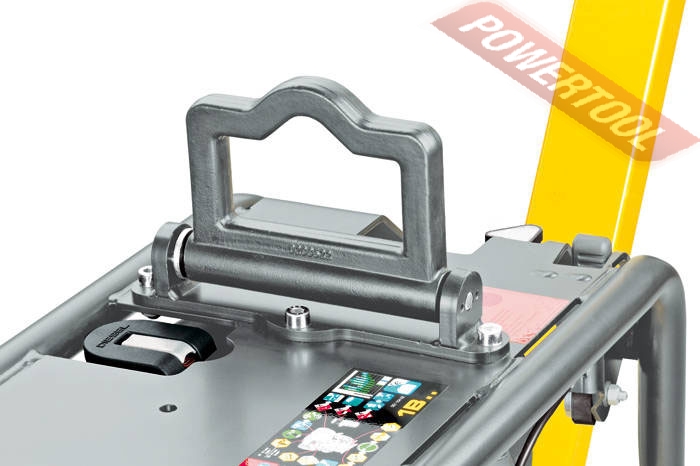 • Инновационная рукоять управления имеет эргономичную форму и полностью откидывается вперед, что с одной стороны очень удобно при транспортировке, а с другой стороны позволяет управлять плитой одной рукой и особенно удобна в поворотах. В месте соединения рукоятки с плитой стоят дополнительные амортизаторы для снижения уровня вибрации дополнительные амортизаторы встроены в ручку управления с которой непосредственно контактирует оператор, т.е. виброзащита носит двойной характер. Безопасная транспортировка обеспечивается безлюфтовым механизмом блокировки направляющей рукояти.