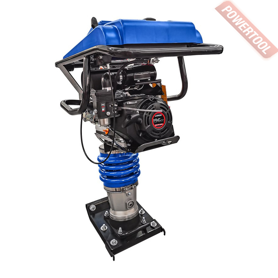 Вибротрамбовка бензиновая, вес 79 кг, размер подошвы 340х285 мм, усилие уплотнения 10 кН, частота ударов 400-650 уд/мин, глубина уплотнения 25-40 см, рабочая скорость 10-13 м/мин, 4-тактный бензиновый двигатель Loncin G168F объемом 163 куб.см и мощностью 4,78 л.с., топливный бак 2,8 л, емкость картера 0,6 л, габариты 770х550х1070 мм.
